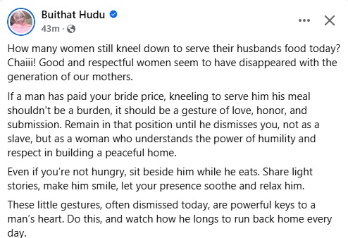 “How many women still kneel down to serve their husbands food today? Chaiii! Good and respectful women seem to have disappeared with the generation of our mothers,” she wrote in a Facebook post on Tuesday.