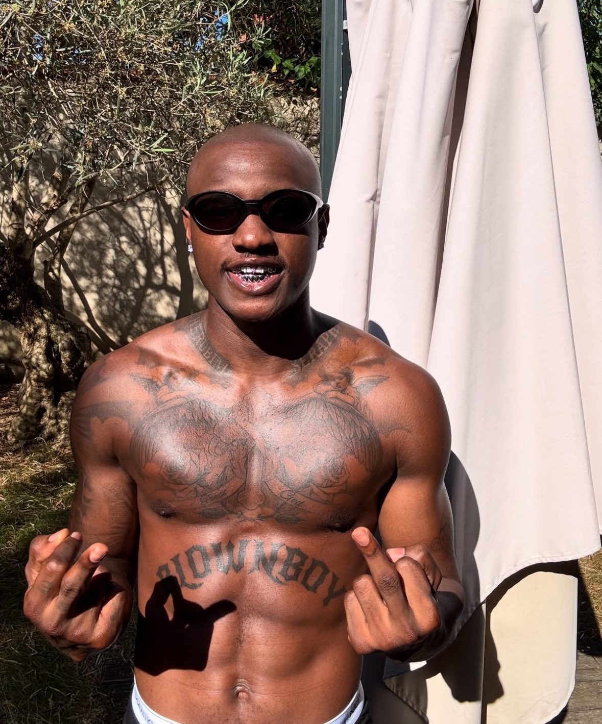 The singer went shirtless to flaunt his tattoo collection.