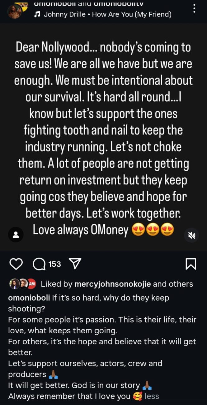 She wrote: “Dear Nollywood, Nobody is coming to save us! We are all we have, but we are enough. We must he intentional about our survival. It’s hard all around. I know, but let’s support the ones fighting tooth and nail to keep the industry running. Let’s not choke them.