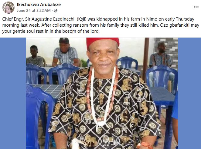 Suspected kidnappers have reportedly k!lled Chief Augustine Ezedinachi, also known as Ogbuefi Ozo Nnanyelugo, a respected traditional titleholder and community leader in Nimo, Njikoka Local Government Area of Anambra State, despite receiving a N15 million ransom.