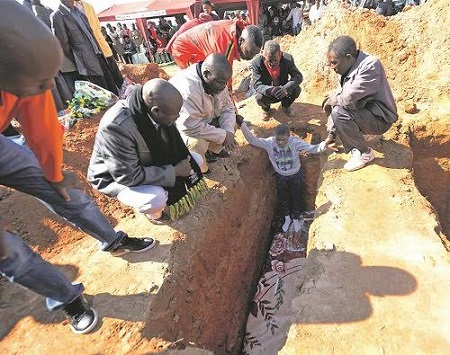 Some time ago, an 11-year-old boy was allegedly killed by his father to please his stepmother recently but he was buried on May 19, in Kagiso, Mogale City, South Africa. As tradition demands, the boy’s twin sister was lowered into the grave before and after his coffin was lowered.