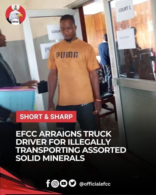 The statement reads: "The Ilorin Zonal Directorate of the Economic and Financial Crimes Commission, EFCC, has arraigned a truck driver, Olamilekan Basit, before Justice Abimbola Awogboro of the Federal High Court, Ilorin, for unlawfully transporting assorted solid minerals without proper authorization at Balla, in Asa Local Government Area of Kwara State."