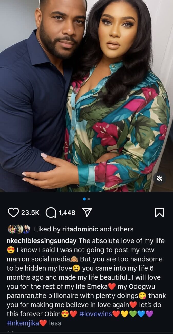 She wrote: "The absolute love of my life😍 I know I said I was not going to post my new man on social media🙈 But you are too handsome to be hidden my love😩 you came into my life 6 months ago and made my life beautiful…I will love you for the rest of my life Emeka❤️ my Odogwu paranran,the billionaire with plenty doings😋 thank you for making me believe in love again❤️ let’s do this forever Obim😍❤️ #lovewins❤️💛💚💙💜 #nkemjika❤️The absolute love of my life😍 I know I said I was not going to post my new man on social media🙈 But you are too handsome to be hidden my love😩 you came into my life 6 months ago and made my life beautiful…I will love you for the rest of my life Emeka❤️ my Odogwu paranran,the billionaire with plenty doings😋 thank you for making me believe in love again❤️ let’s do this forever Obim😍❤️ #lovewins❤️💛💚💙💜 #nkemjika❤️"