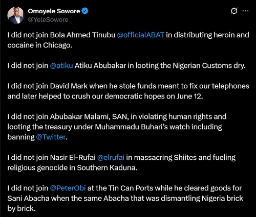 Specifically targeting Obi, Sowore wrote, “I did not join Peter Obi at the Tin Can Ports while he cleared goods for Sani Abacha when the same Abacha that was dismantling Nigeria brick by brick.”