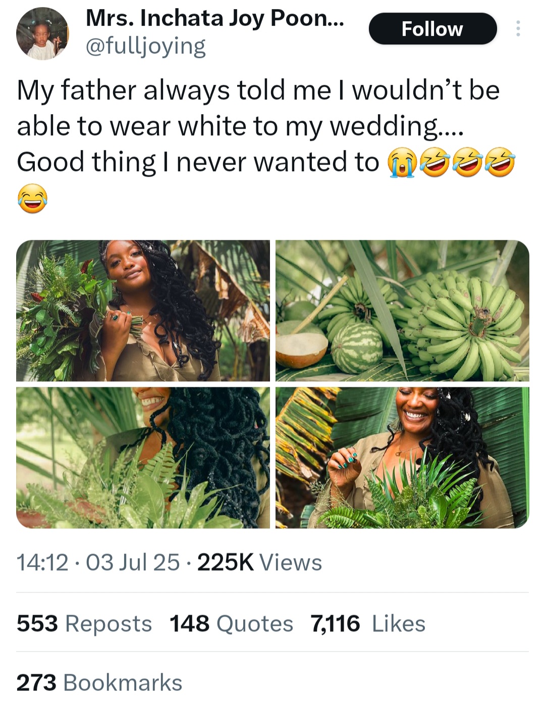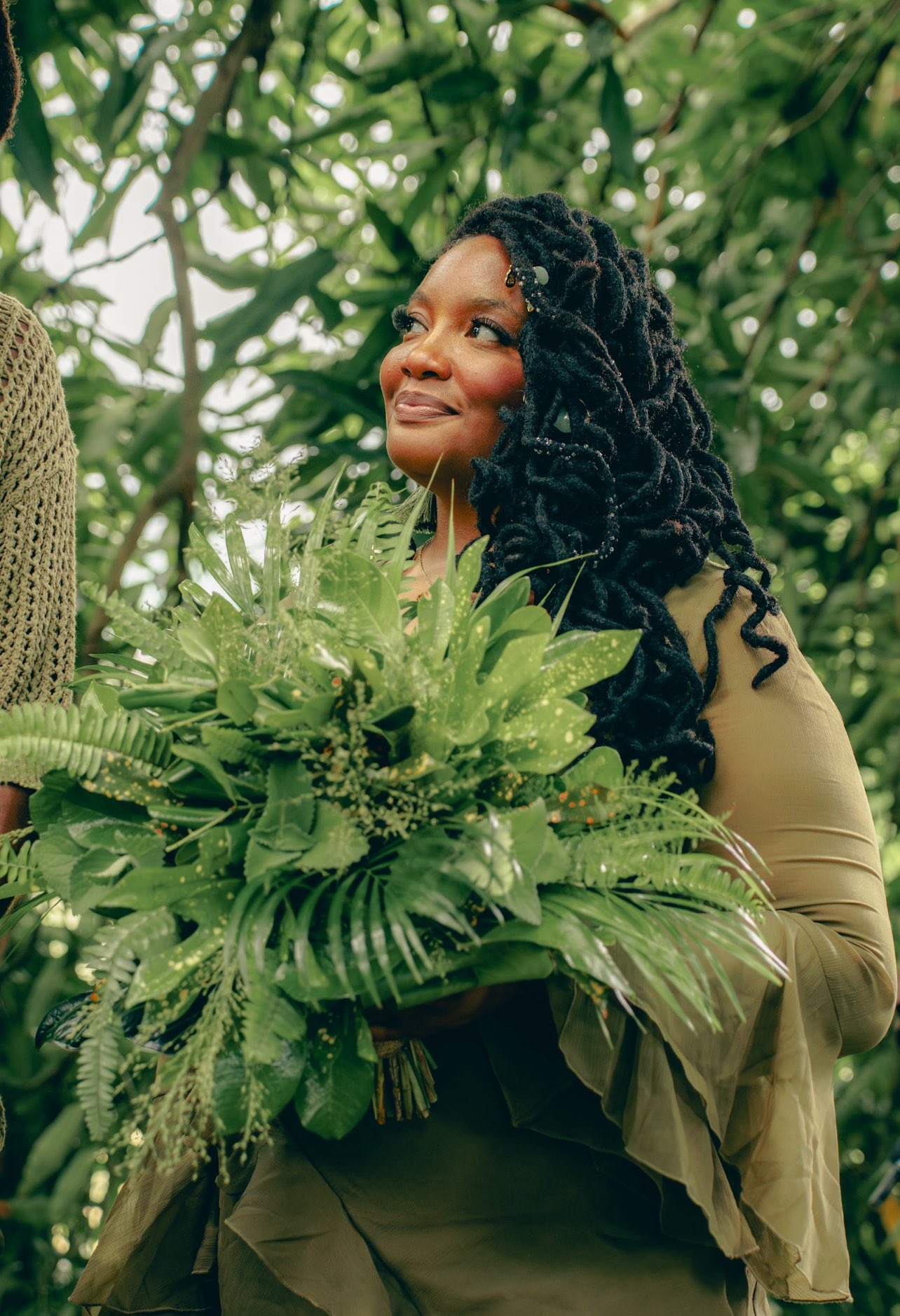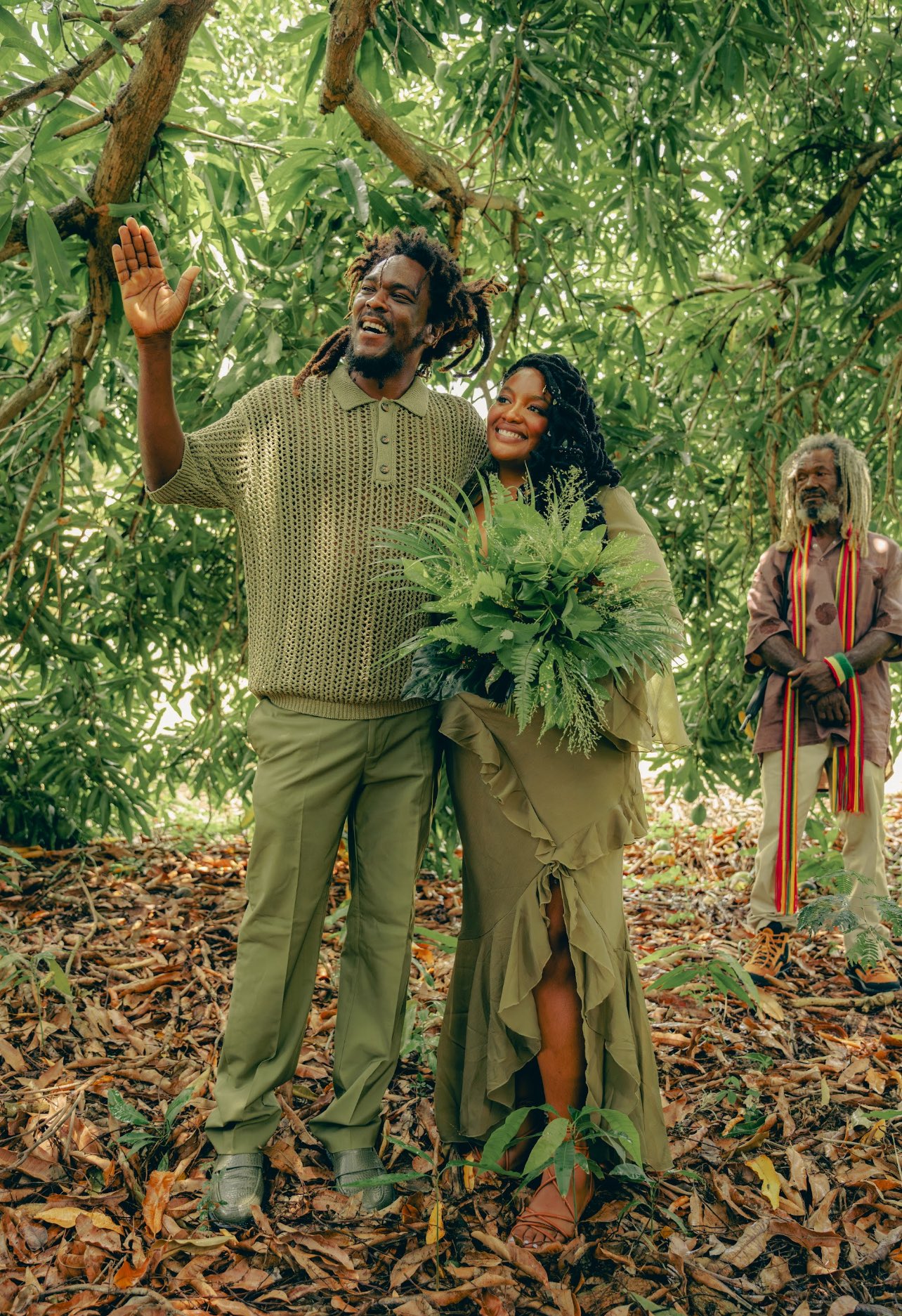For her bouquet, the bride chose flowers from her farm as they said their vows under a mango tree in the middle of their garden.