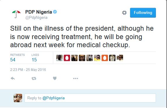 In a series of tweets, PDP has alleged that President Buhari is critically ill and set to be flown out of the country. He is currently receiving treatment in Nigeria they stated in the tweet.