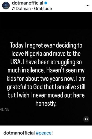 “Today, I regret ever deciding to leave Nigeria and move to the US. I have been struggling so much in silence. [I] haven’t seen my kids for about two years now,” a post on his Instagram page read in part.