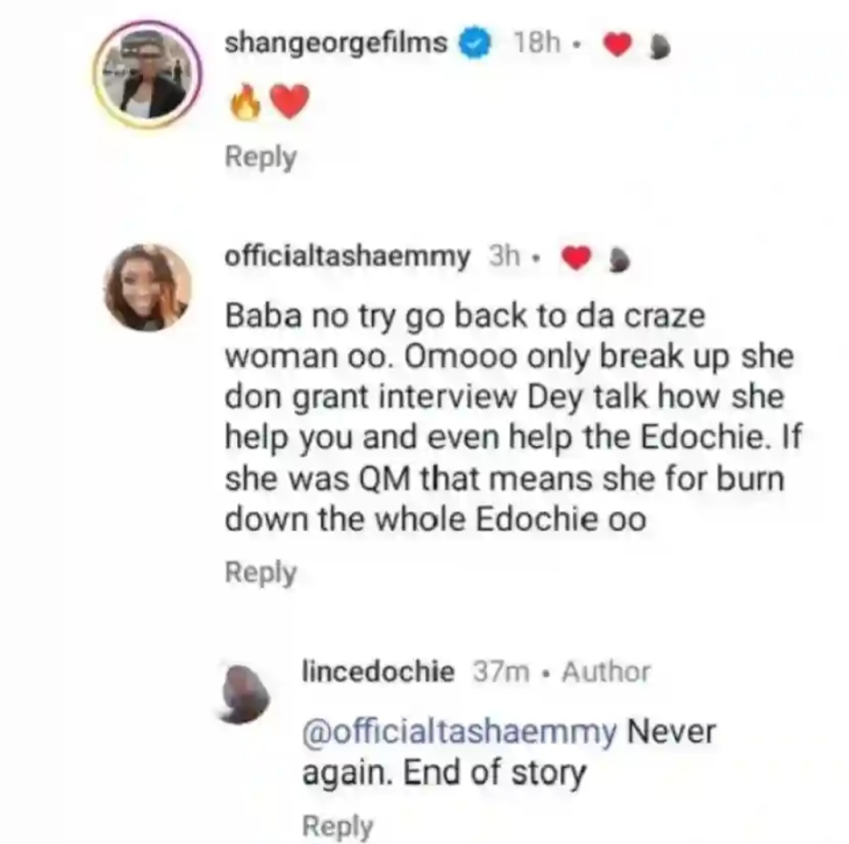 After her post was publicised, an Instagram user took to Linc's Instagram account to tell him not to take Yinka back.