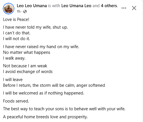 Leo Umana, the Executive Director of the Akwa Ibom State Internal Revenue Service (AKIRS) has revealed how he keeps peace in his family.