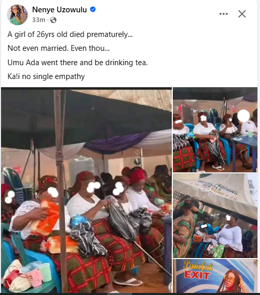 “A girl of 26yrs old d!ed prematurely. Not even married. Even thou…Umu Ada went there and be drinking tea. Kai! No single empathy,” she wrote.