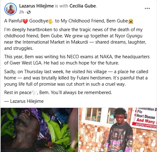"A Painful Goodbye to My Childhood Friend, Bem Gube. I’m deeply heartbroken to share the tragic news of the d3ath of my childhood friend, Bem Gube. We grew up together at Nyor Gyungu near the International Market in Makurdi — shared dreams, laughter, and struggles," he wrote.