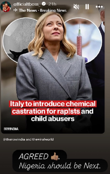Big Brother Naija reality star, Tokunbo Idowu aka TBoss has demanded the introduction of chemical castration for r3pists and child abusers.