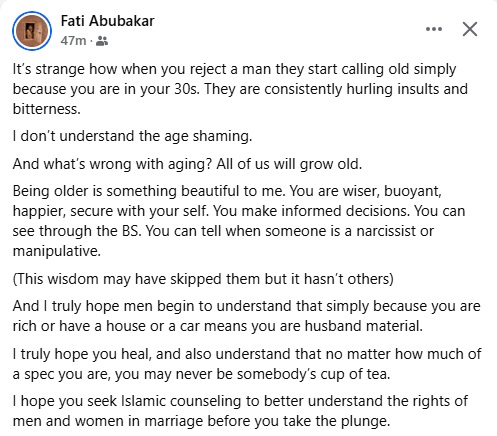 “It’s strange how when you reject men, they start calling old simply because you are in your 30s. They are consistently hurling insults and bitterness. I don’t understand the age shaming.