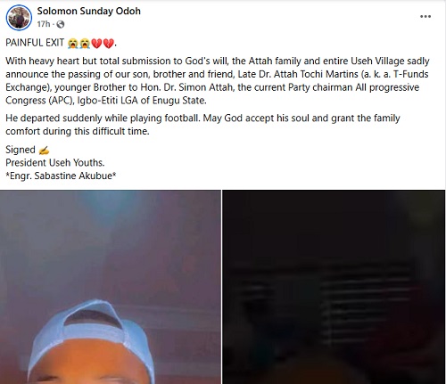 “With heavy heart but total submission to God's will, the Attah family and entire Useh Village sadly announce the passing of our son, brother and friend, Late Dr. Attah Tochi Martins (a. k. a. T-Funds Exchange), younger Brother to Hon. Dr. Simon Attah, the current Party chairman All progressive Congress (APC), Igbo-Etiti LGA of Enugu State. He departed suddenly while playing football. May God accept his soul and grant the family comfort during this difficult time,” the statement read.