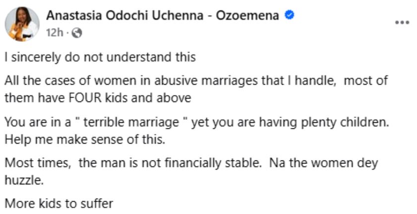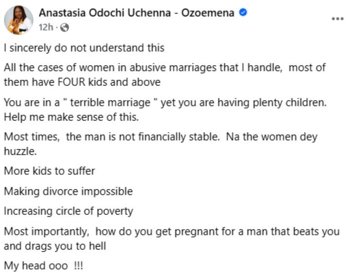 Nigerian journalist Anastasia Odochi Ozoemena has questioned why women in abusive marriages often have multiple children, a decision she believes makes it harder for them to leave such toxic relationships.
