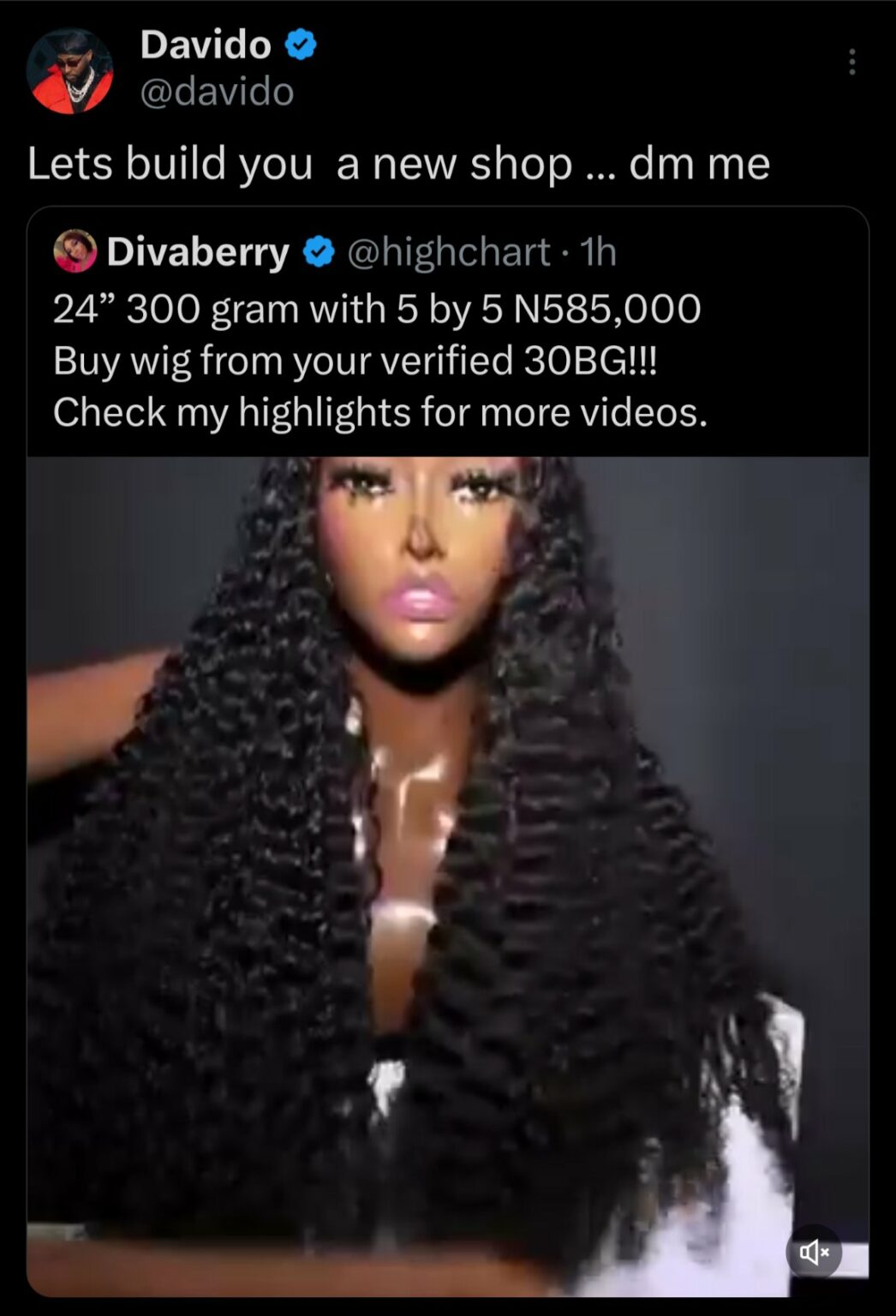 “I’m so grateful 🥹 so finally I will own a shop and my idolo @davido is building me one 💯💯🙏🏽🙏🏽