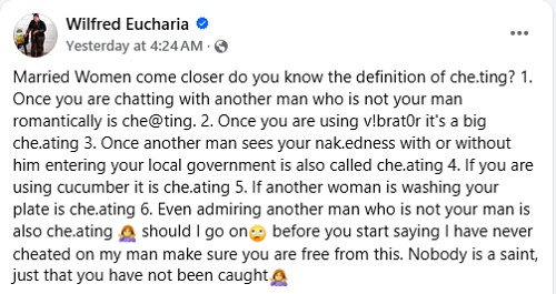 “Married Women come closer do you know the definition of cheating? 1. Once you are chatting with another man who is not your man romantically is che@ting. 2. Once you are using v!brat0r it's a big che.ating 3. Once another man sees your nak.edness with or without him entering your local government is also called che.ating 4. If you are using cucumber it is che.ating 5. If another woman is washing your plate is che.ating 6. Even admiring another man who is not your man is also che.ating. Should I go on before you start saying I have never cheated on my man make sure you are free from this. Nobody is a saint, just that you have not been caught,” she wrote in a Facebook post on Tuesday.