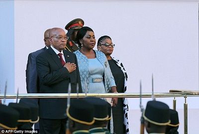 South African President Jacob Zuma flanked by his wife Gloria Bongekile Ngema Zuma stands for the National Anthem