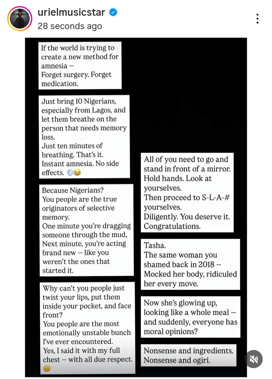 Reacting to the attacks, Uriel reminded Nigerians that they were the same ones who shamed Tacha's natural body in 2018 and they are now shaming her for working on the same body they criticised.