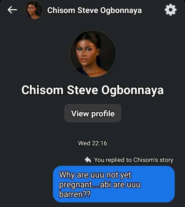 Nollywood actress Chisom Steve has responded after a troll accused her of being barren.