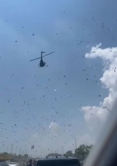 The helicopter is seen releasing dollar notes and rose petals over a crowd of funeral guests.