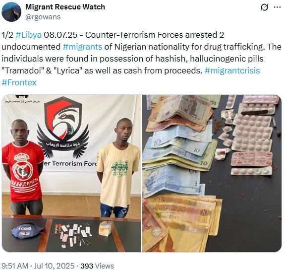 "08.07.25 - Counter-Terrorism Forces arrested 2 undocumented #migrants of Nigerian nationality for drug trafficking. The individuals were found in possession of hashish, hallucinogenic pills "Tramadol" & "Lyrica" as well as cash from proceeds," the statement read.