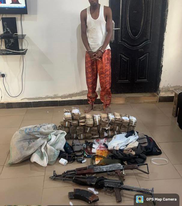 A thorough search of the suspect and the vehicle led to the recovery of: Two AK-47 rifles, two magazines loaded with 30 rounds of 7.62mm (special) ammunition, three mobile phones, one knife, one football, Assorted charms, one torchlight, sum of N13,742,000 in cash, suspected to be ransom money.