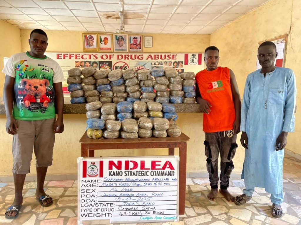 Three other suspects, Shamsudini Abdullahi, 35; Adamu Abdullahi, 21; and Magaji Rabo, 26, were nabbed with 48.1kg of skunk at Janguza Barracks area of Kano State by NDLEA operatives on Wednesday 9th July.