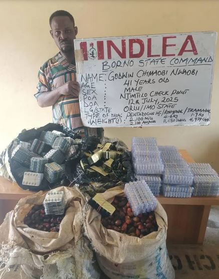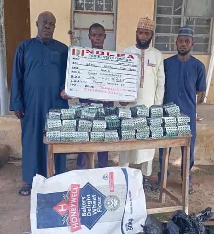 While NDLEA operatives in Borno State on Saturday 12th July arrested Godwin Chimaobi Nwaobi, 42, with 18,759 ampoules of pentazocine, pills of tramadol and rohypnol at Njimtilo, Maiduguri, coming on the heels of the seizure of 10,000 pills of tramadol from another suspect, Abdulrahman Bello Ahmadu, 34, on Wednesday 9th July, their counterparts in Gombe State recovered a total of 116,226 pills of tramadol and D5 from five suspects: Hafiz Bello, 22; Isah Suleman, 48; Kabiru Muhammed, 30; Abdullahi Adamu, 30; and Abel Murna, 25, at Gombe Main Market and along Gombe Kano road on Tuesday 8th and Saturday 12th July.