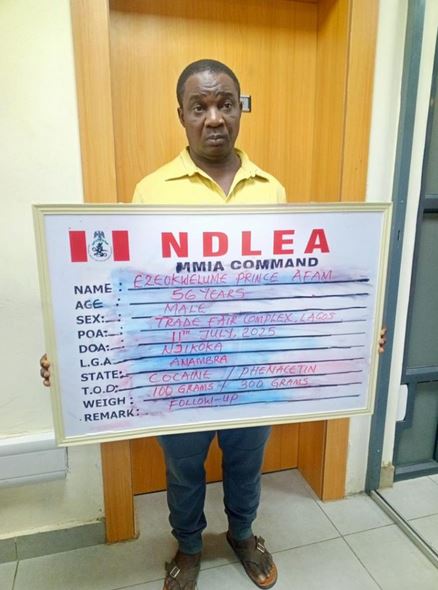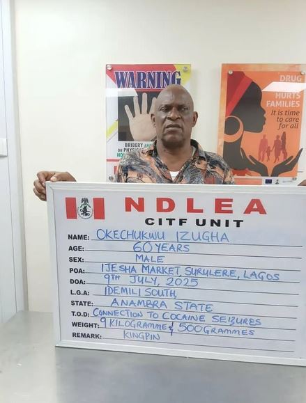 Meanwhile, a notorious drug kingpin, Okechukwu Izugha (a.k.a. Okey Omeogo), has been arrested in Lagos by operatives of a Special Operations Unit of NDLEA after 12 months of going into hiding. He was nabbed on Wednesday 9th July at his wife’s shop in Ijesha Market.