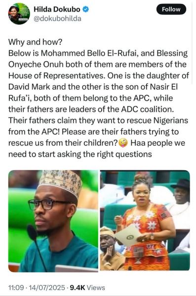 Dokubo shared her thoughts online, posting photos of Mohammed Bello El-Rufai and Blessing Onyeche Onuh — members of the House of Representatives.