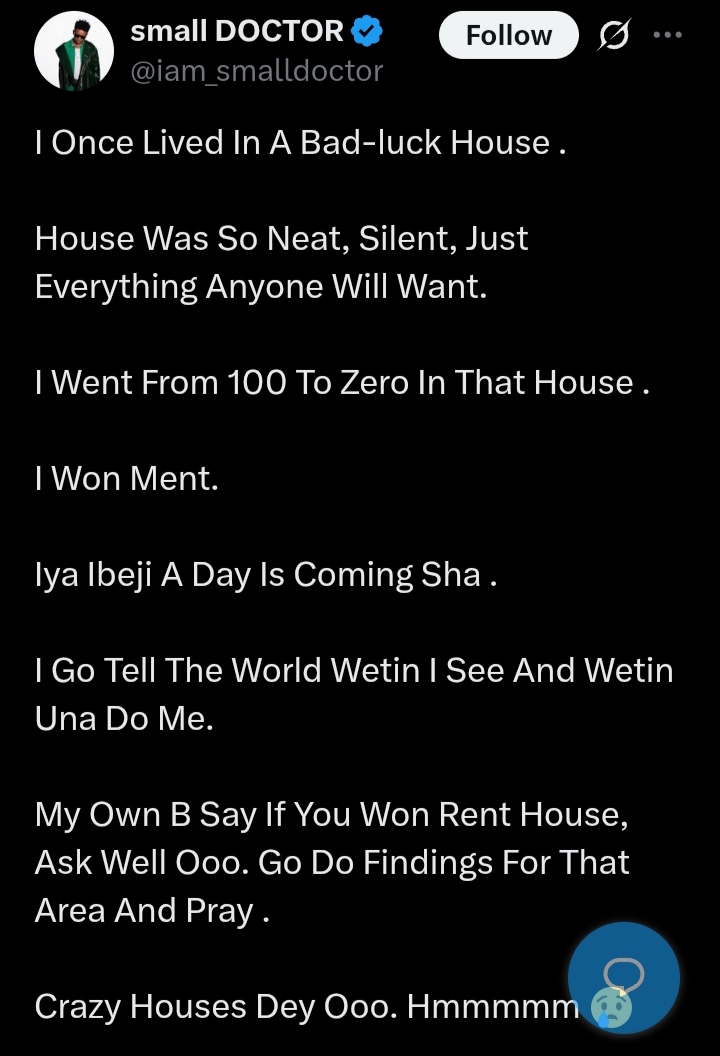 Singer Small Doctor has revealed that he once lived in a 'bad luck' house.