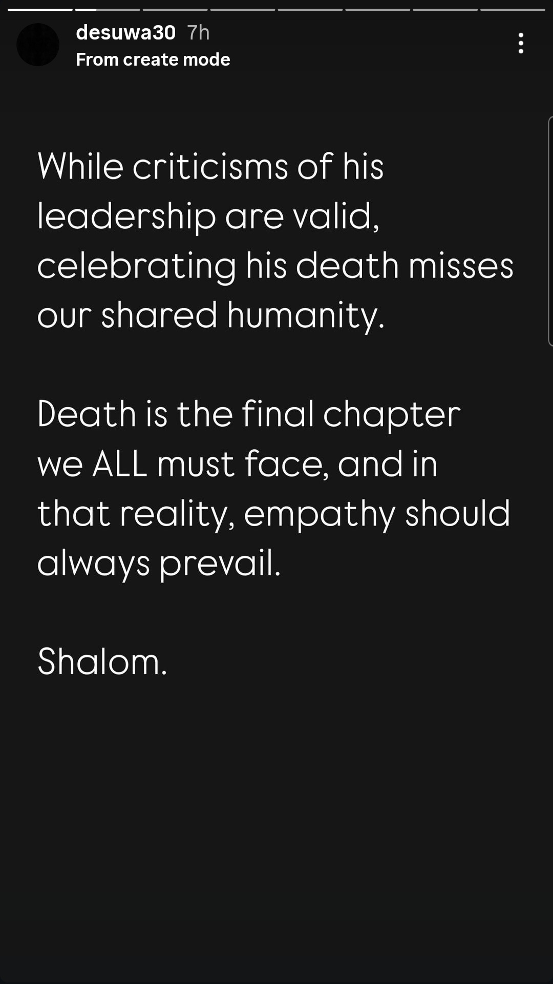 She added: "While criticisms of his leadership are valid, celebrating his de@th misses our shared humanity.