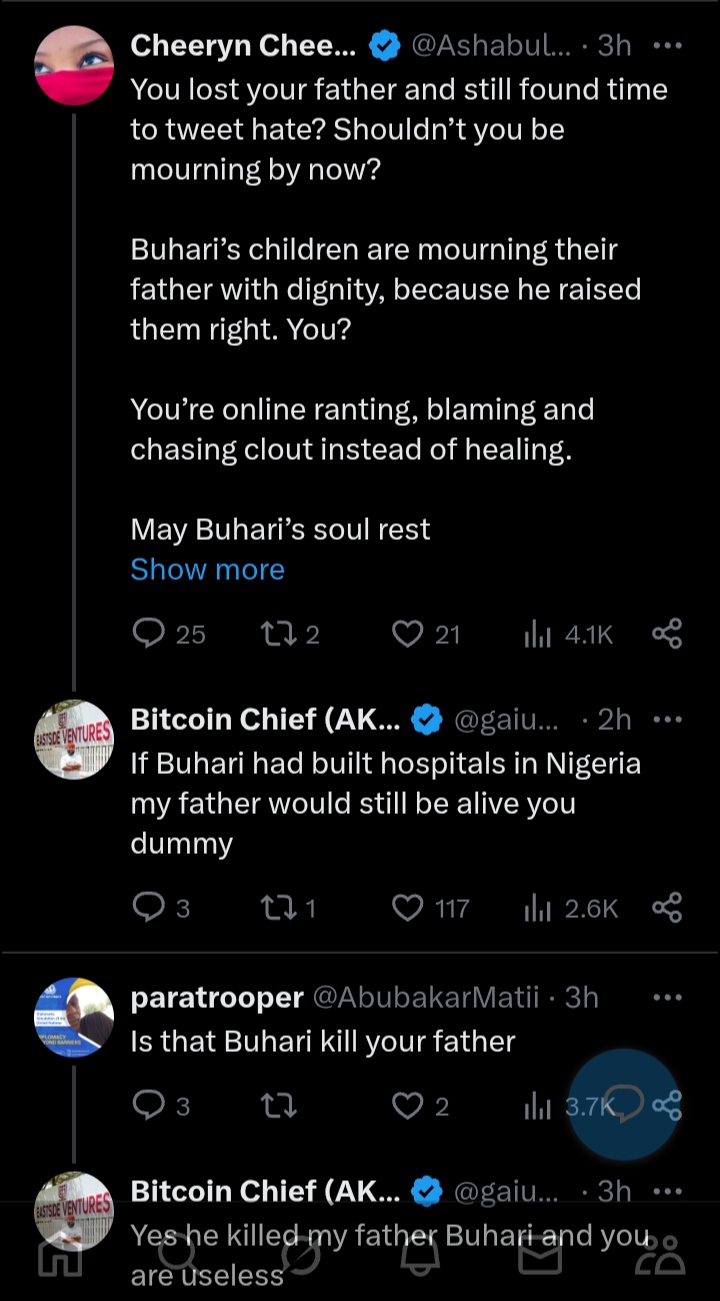 He had announced his dad’s passing after he mocked the late Nigerian leader who died on Sunday.