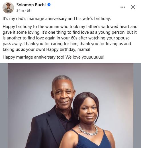 Solomon Buchi, the Nigerian writer and social commentator, has celebrated his stepmother on the occasion of her birthday and wedding anniversary with his father.