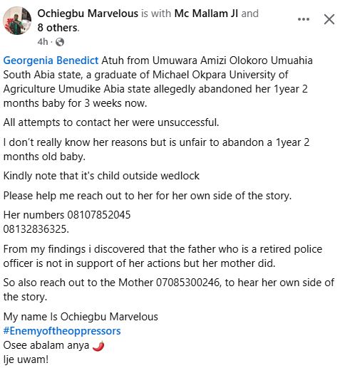 “Georgina Benedict Atuh from Umuwara Amizi Olokoro Umuahia South Abia state, a graduate of Michael Okpara University of Agriculture Umudike Abia state allegedly abandoned her 1year 2 months baby for 3 weeks now,” he wrote.
