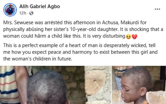 A woman identified as Mrs. Sewuese has been arrested for allegedly physically assaulting her sister's 10-year-old daughter in the Achusa area of Makurdi, Benue State.