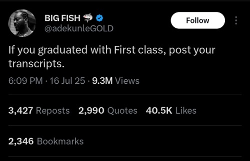 — BIG FISH 🦈 (@adekunleGOLD) July 16, 2025
