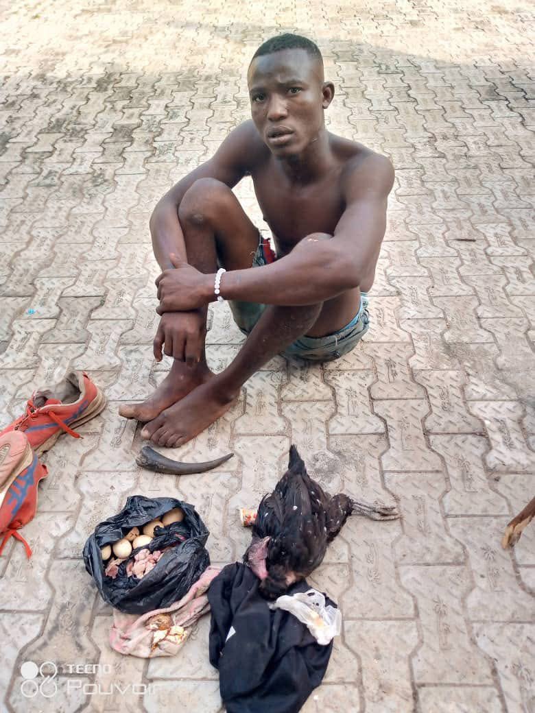 Items recovered from him include a dead chicken, nine unhatched rotten eggs, an animal horn, a bottle containing powdered substance, and pieces of fresh meat.