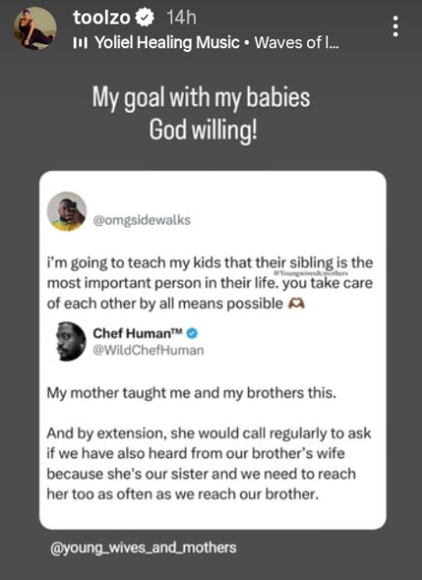 The mother of two stated this in a post on her Instagram story when she shared a screenshot by an X user who said that he will teach his kids the same.