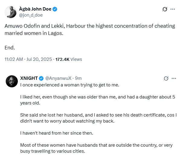 According to him, Amuwo Odofin and Lekki axis of Lagos state harbour the most cheating married women.