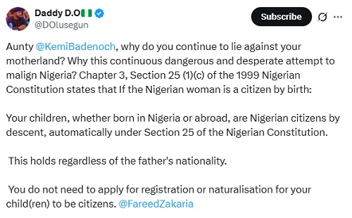He was reacting to her recent comments on Nigerian citizenship, accusing her of misrepresenting the country’s laws.