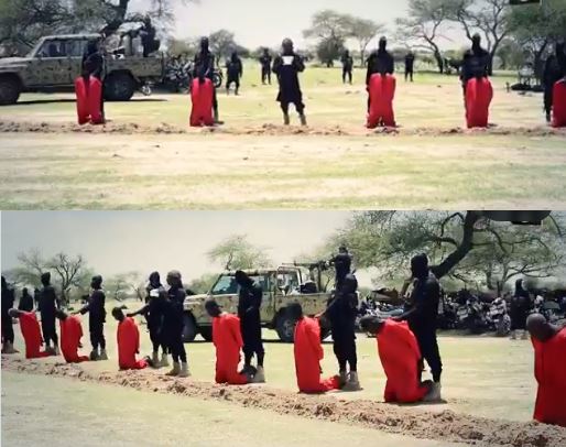 The footage shows the victims, dressed in red jumpsuits, kneeling with armed fighters standing behind them, holding rifles and jackknives.