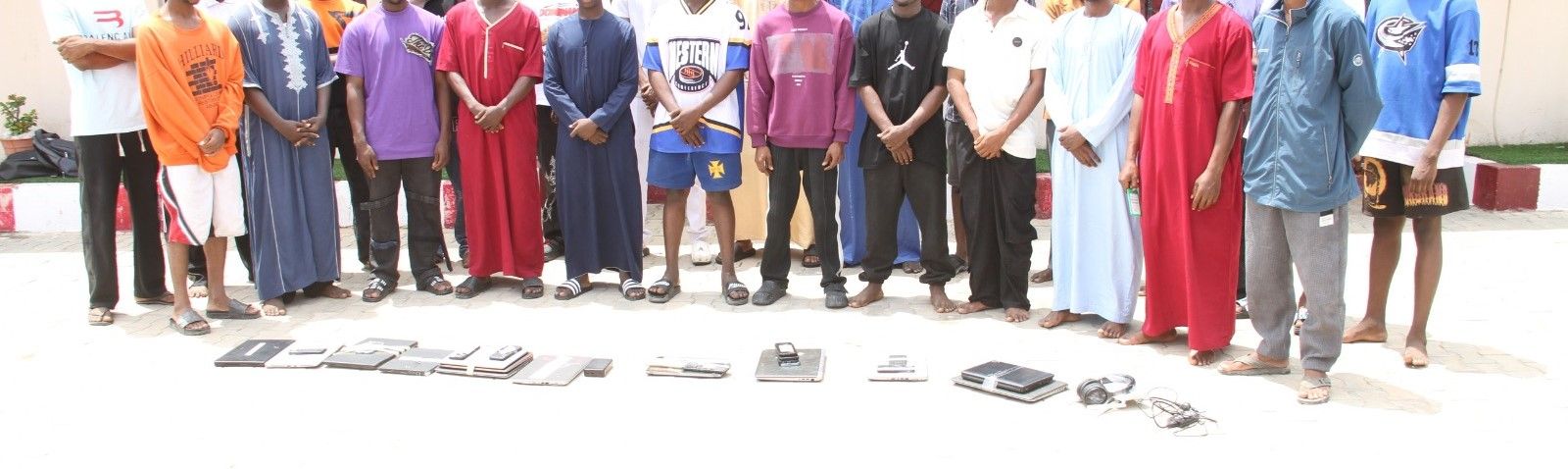 The suspects, Ismaíl Nura, Suuleyman Ayeh, Usman Abdulrazaq, Emmanuel Chigozie, Akabe Seth, Daniel Imoter, Abdulganiyu Jimoh, Jafar Abubakar, Usman Nuraddeen, Mohammad Adnan, Abubakar Abusufyan, Abdulmalik Ibrahim, Abubakar Sadiq, Daniel Masamu, Abdulrasheed Abdulsamad, Issac Dosunu, Nuraddeen Ogunbiyi, Onyeyemi Kaleem, Miracle Joseph, Danjuma Musa, Ibrahim Mubaraq, Yusuf Salihu, Lawal Ibrahim Edebo, Abdulmajeed Suleiman and Dauda Abdulhamid were arrested following weeks of surveillance linked to their alleged involvement in internet fraud, identity theft, and financial scam.