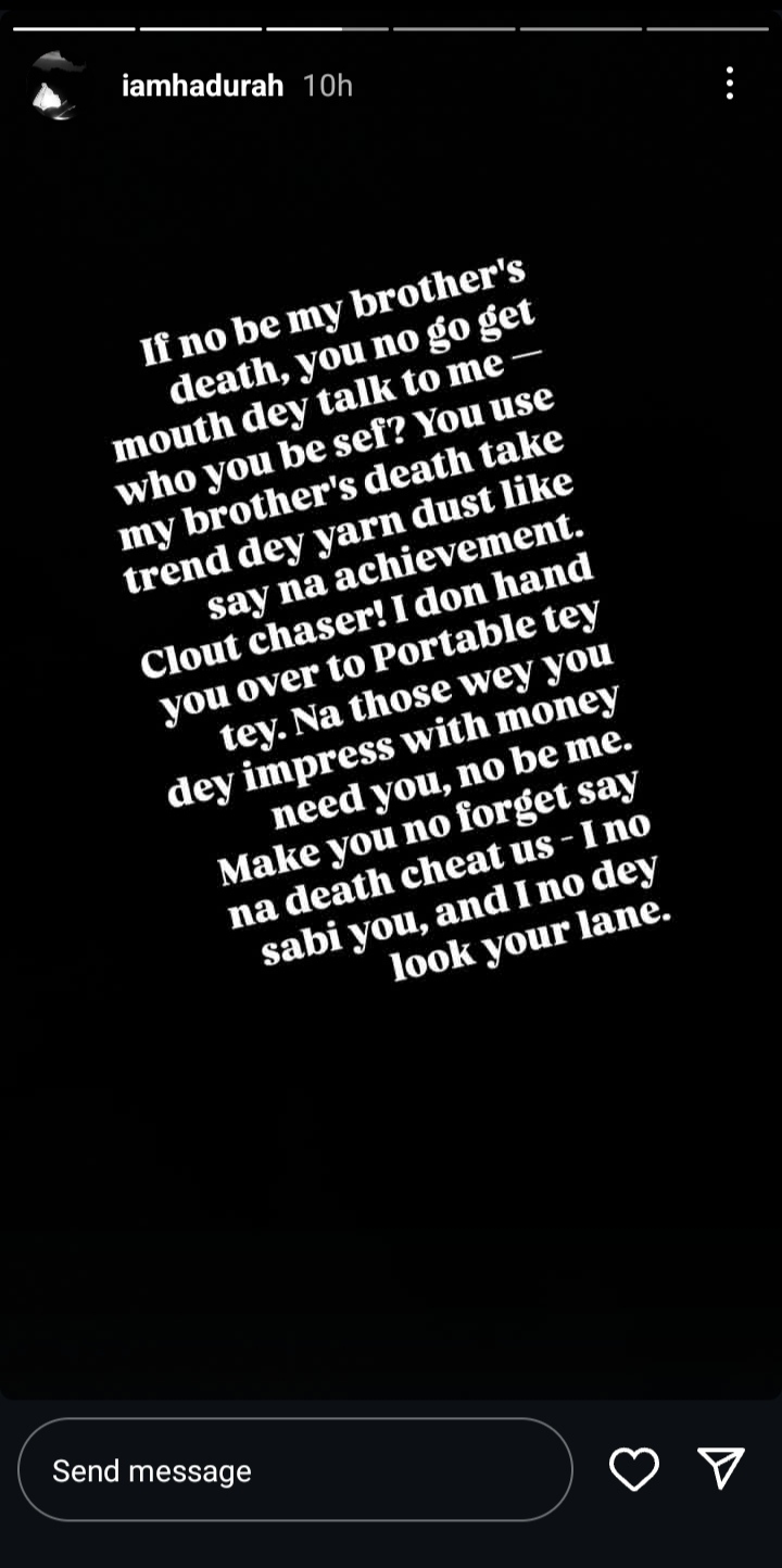 “If no be my brother’s death, you no go get mouth dey talk to me — who you be sef? You use my brother’s death take trend dey yarn dust like say na achievement. Clout chaser! I don hand you over to Portable tey tey. Na those wey you dey impress with money need you, no be me. Make you no forget say na death cheat us – I no sabi you, and I no dey look your lane.