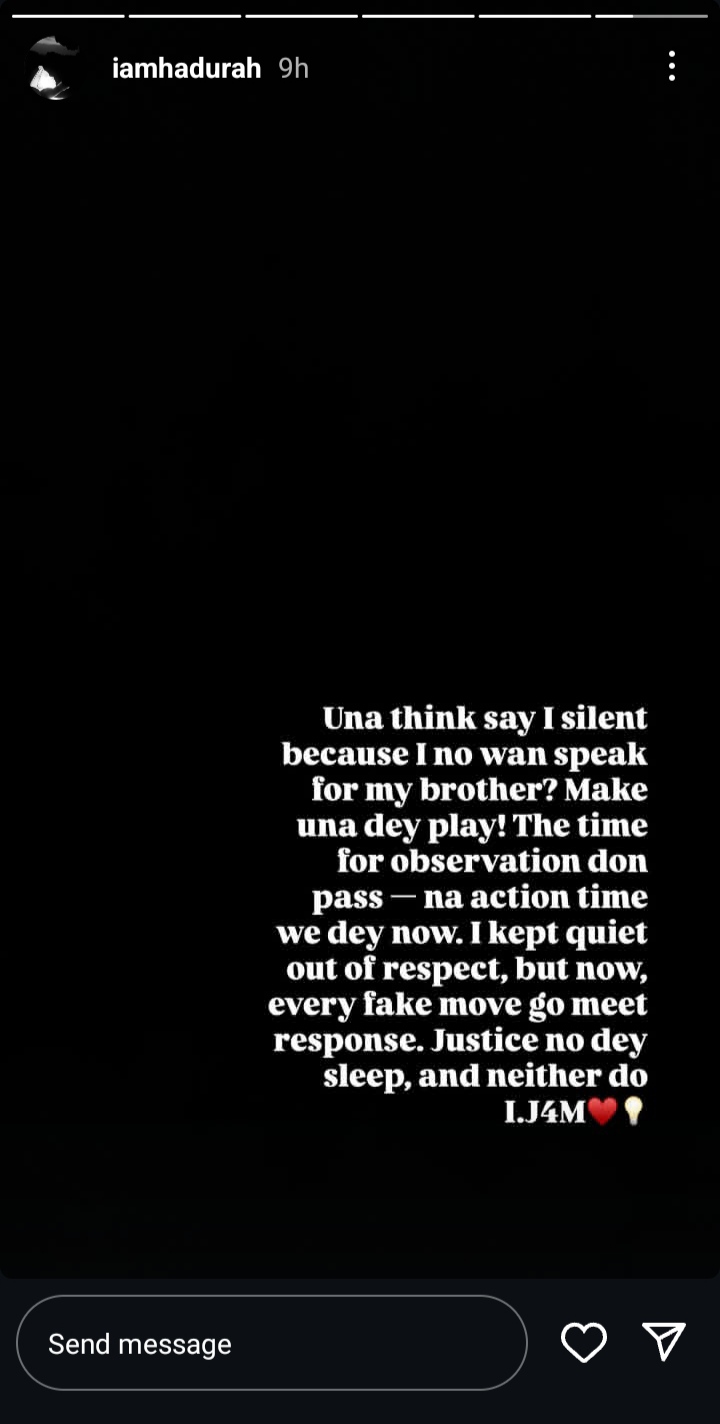 Una think say I silent because I no wan speak for my brother? Make una dey play! The time for observation don pass — na action time we dey now. I kept quiet out of respect, but now, every fake move go meet response. Justice no dey sleep, and neither do”