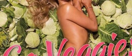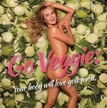 Amanda looks delighted as she relaxes on a bed of fresh green vegetables below the words “Go Veggie – Your Body Will Love You for It”.