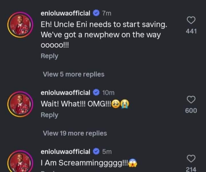 Reacting to the news, Enioluwa took to the comment section to reveal that he's going to be an uncle soon.