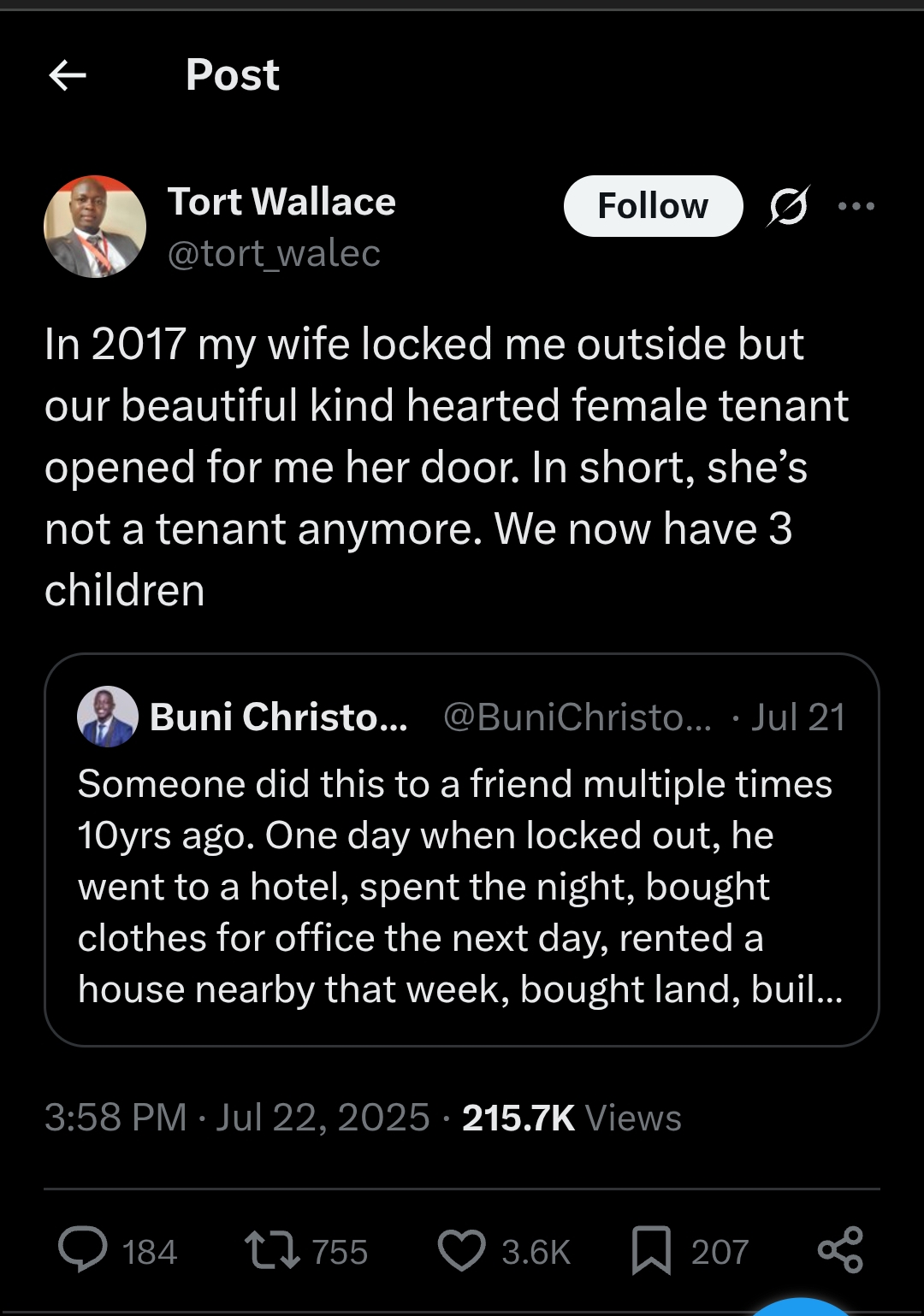 His statement comes amid an ongoing debate on X about whether a wife has the right to lock her husband out of the house for returning home late.