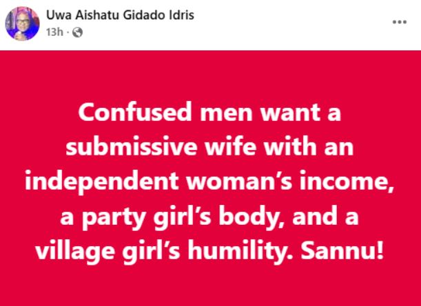 “Confused men want a submissive wife with an independent woman’s income, a party girl’s body, and a village girl’s humility. Sannu,” she wrote.